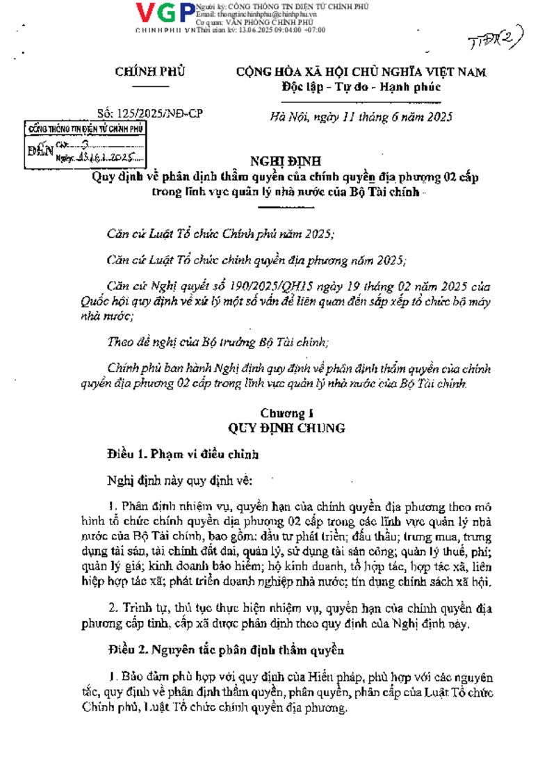 Tiêu đề văn bản | Nghị định số 125/2025/NĐ-CP ngày 11/6/2025 của Chính phủ quy định về phân định thẩm quyền của chính quyền địa phương 02 cấp trong lĩnh vực quản lý Nhà nước của Bộ Tài chính | ||