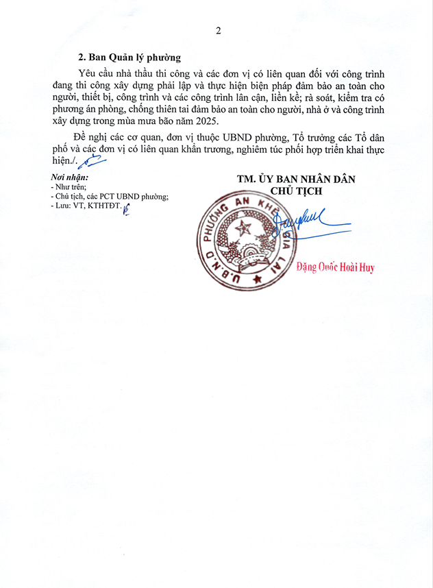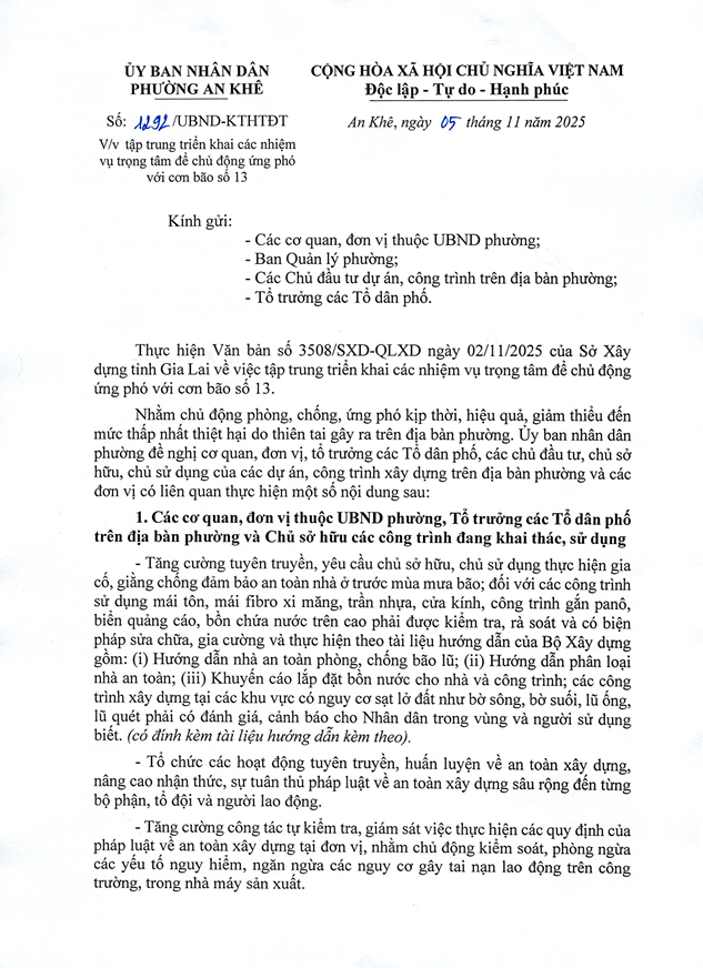 Công văn số 1292/UBND-PKTHTDT ngày 05/11/2025 của UBND Phường An Khê V/v tập trung triển khai các nhiệm vụ trọng tâm để chủ động ứng phó với cơn bão số 13