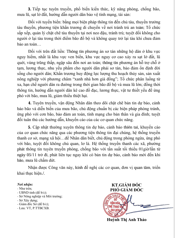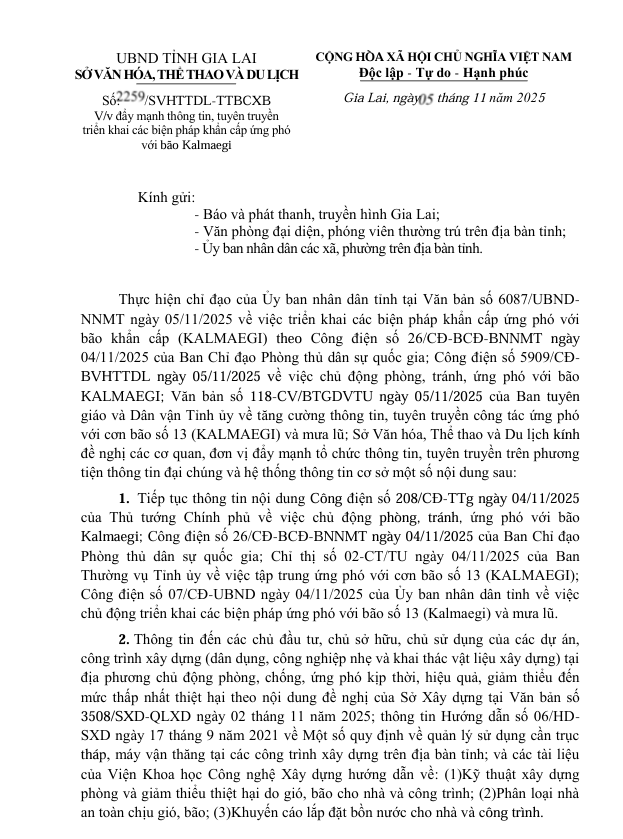 Triển khai công điện số 08/CĐ-UBND ngày 05/11/2025 của UBND tỉnh về việc triển khai các biện pháp ứng phó với bão số 13 (Kalmaegi) và mưa lũ.