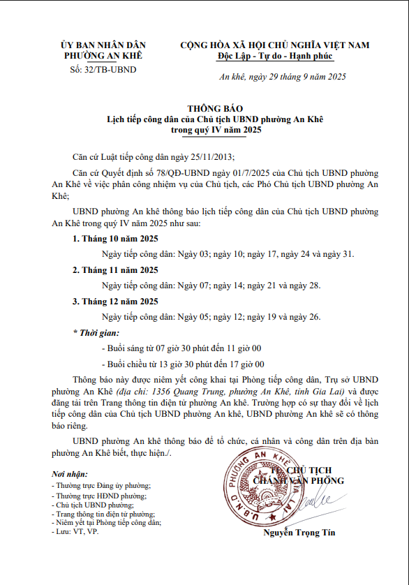 Thứ ba, 30/09/2025 | 07:48 A- A A+ | Thông báo Lịch tiếp công dân của Chủ tịch UBND phường An Khê trong quý IV năm 2025 Chia sẻ Đọc bài Lưu Thông báo số 32/TB-UBND ngày 29/9/2025 của UBND phường An Khê về Lịch tiếp công dân của Chủ tịch UBND phường An Khê trong quý IV năm 2025