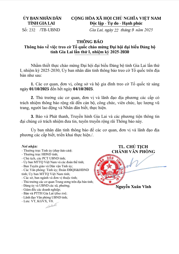 Thông báo số 232/TB-UBND ngày 22/9/2025 của UBND tỉnh Gia Lai Thông báo về việc treo cờ tổ quốc chào mừng Đại hội đại biểu Đảng bộ tỉnh Gia Lai lần thứ I, nhiệm kỳ 2025-2030