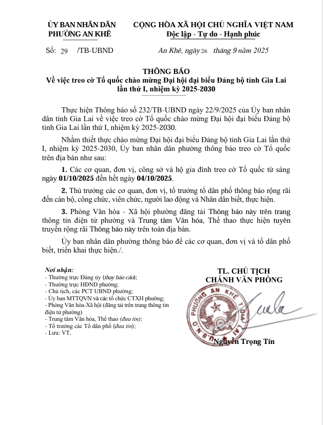 Thông báo số 29/TB-UBND ngày 25/9/2025 của UBND phường An Khê Về việc treo cờ Tổ quốc chào mừng Đại hội đại biểu Đảng bộ tỉnh Gia Lai lần thứ I, nhiệm kỳ 2025-2030