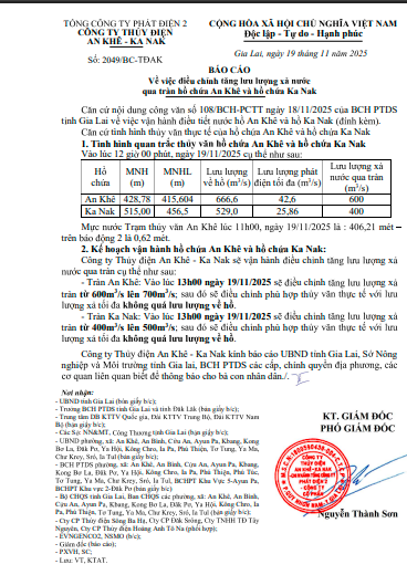 Công ty Thủy điện An Khe Ka Nak se vận hành dieu chinh tang lưu lượng xã nước qua tràn cụ thể như sau: