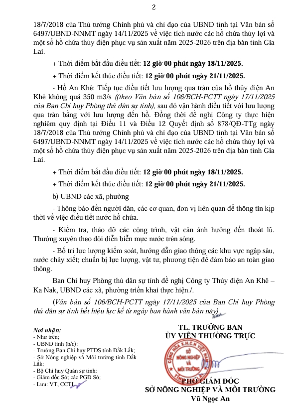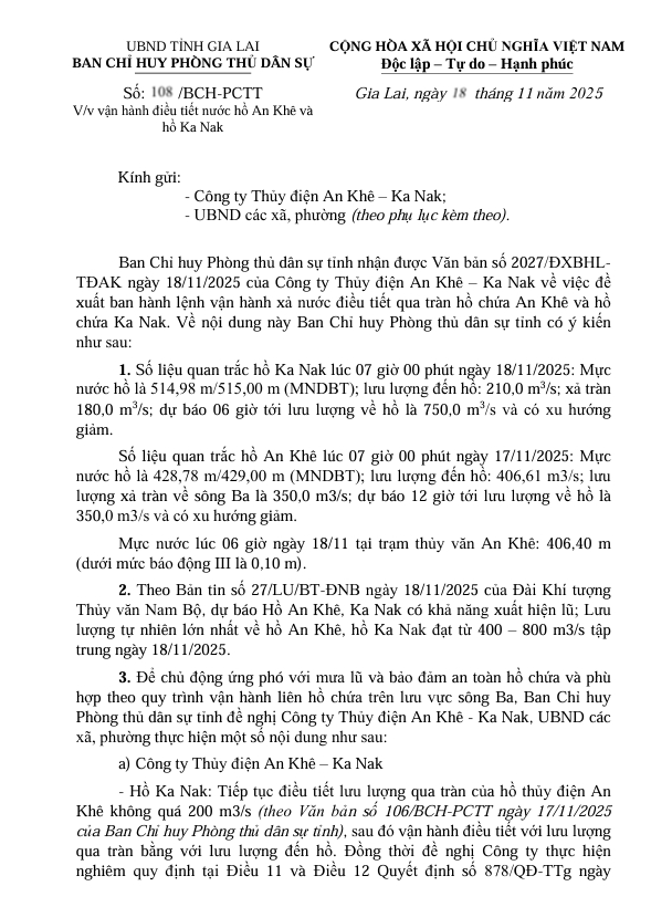 Hồ An Khê: Tiếp tục điều tiết lưu lượng qua tràn của hồ thủy điện An Khê không quá 350 m3/s ((theo Văn bản số 106/BCH-PCTT ngày 17/11/2025 của Ban Chỉ huy Phòng thủ dân sự tỉnh), sau đó vận hành điều tiết với lưu lượng qua tràn bằng với lưu lượng đến hồ.