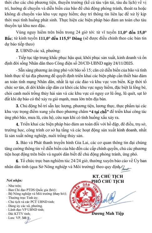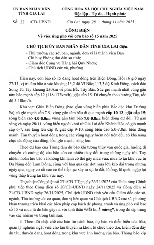 Khu vực Giữa Biển Đông (bao gồm vùng biển phía Bắc đặc khu Trường Sa) có gió mạnh cấp 7-9; vùng gần tâm bão đi qua mạnh cấp 10-12, giật cấp 15; sóng biển cao 4,0-6,0m, vùng gần tâm bão 7,0-9,0m; biển động dữ dội. Từ gần sáng và ngày 28/11, vùng biển ngoài khơi từ Gia Lai đến Khánh Hòa có gió mạnh cấp 6-7, sau tăng lên cấp 8, giật cấp 9-10, sóng biển cao 5,0-7,0m, biển động mạnh. Tàu thuyền hoạt động trong các vùng nguy hiểm nói trên đều có khả năng chịu tác động của dông, lốc, gió mạnh, sóng lớn.