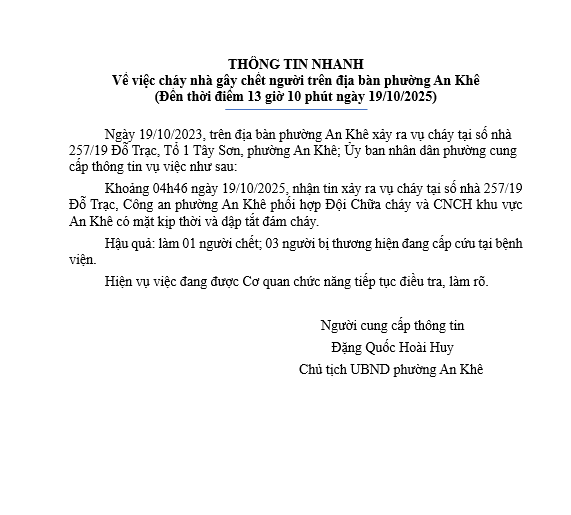 Chủ nhật, 19/10/2025 | 13:49 A- A A+ | Thông tin nhanh về việc cháy nhà gây chết người trên địa bàn phường An Khê (Đến thời điểm 13 giờ 10 phút ngày 19/10/2025) Chia sẻ Đọc bài Lưu Thông tin nhanh về việc cháy nhà gây chết người trên địa bàn phường An Khê (Đến thời điểm 13 giờ 10 phút ngày 19/10/2025)