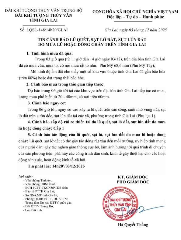 Trong 03 giờ qua (từ 11 giờ đến 14 giờ ngày 03/12), trên địa bàn tỉnh Gia Lai đã có mưa vừa, mưa to, có nơi mưa rất to như: Phù Mỹ 68,6 mm (Phù Mỹ Tây); Mô hình độ ẩm đất cho thấy một số khu vực thuộc tỉnh Gia Lai đã gần bão hòa (trên 80%) hoặc đạt trạng thái bão hòa.