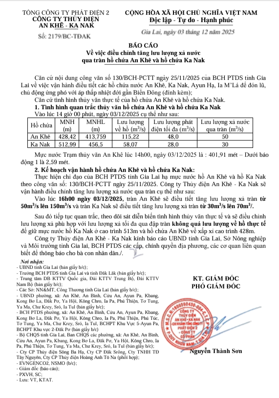 Vào lúc 16h00 ngày 03/12/2025, tràn An Khê sẽ điều tiết tăng lưu lượng xả tràn từ 50m3/s lên 150m3/s và tràn Ka Nak sẽ điều tiết tăng lưu lượng xả tràn từ 30m3/s lên 70m3/.