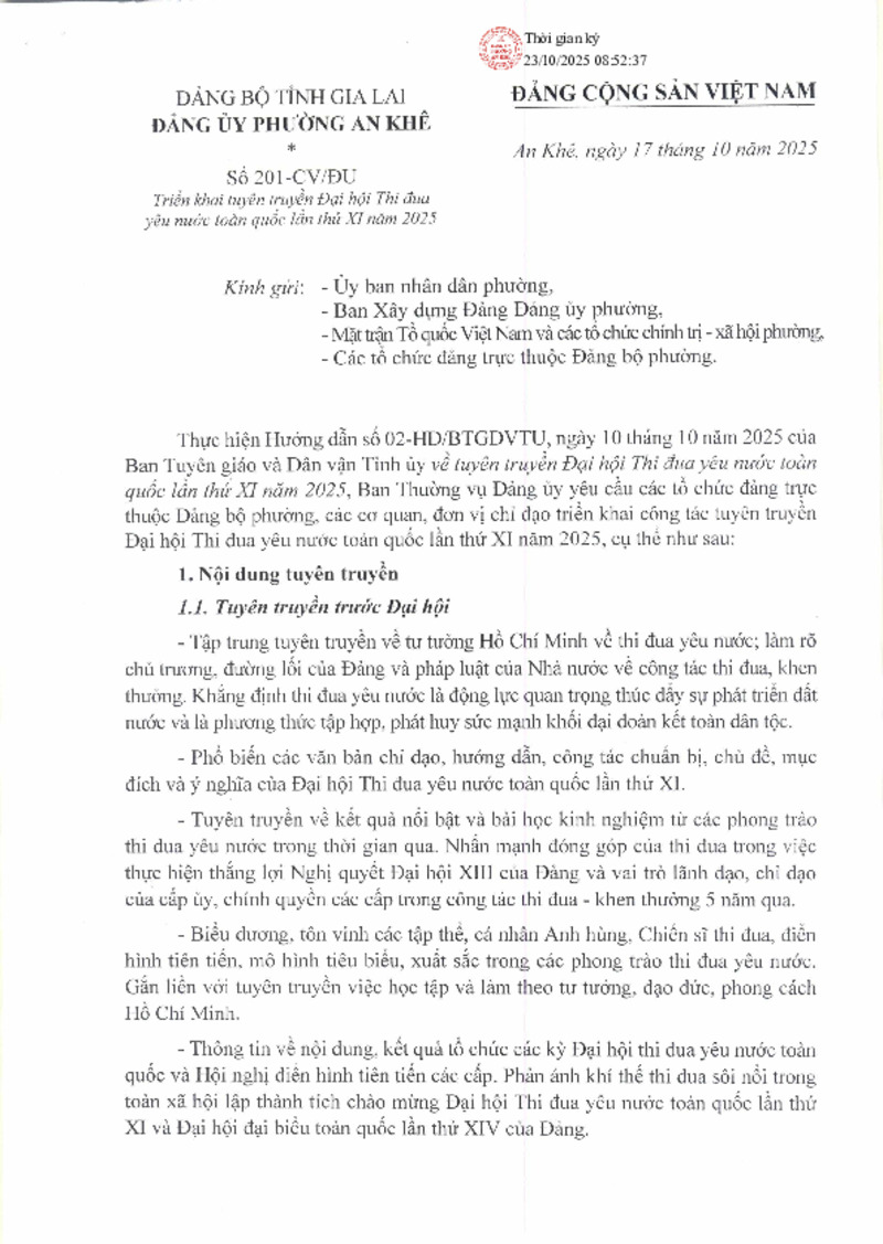 | Tiêu đề văn bản | Công văn số 201/CV/ĐU ngày 17/10/2025 của Đảng ủy Phường An Khê Triển khai tuyên truyền Đại hội Thi đua yêu nước toàn quốc lần thứ XI năm 2025 | ||