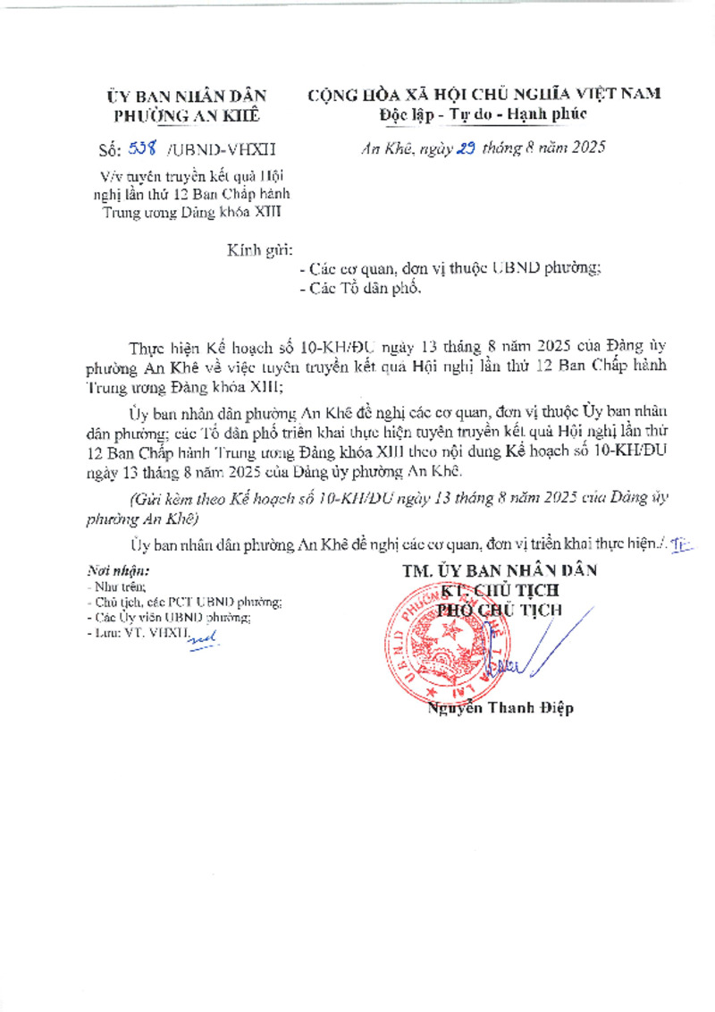 | Số hiệu | 538/UBND-PVHXH | Cơ quan ban hành | UBND phường An Khê |